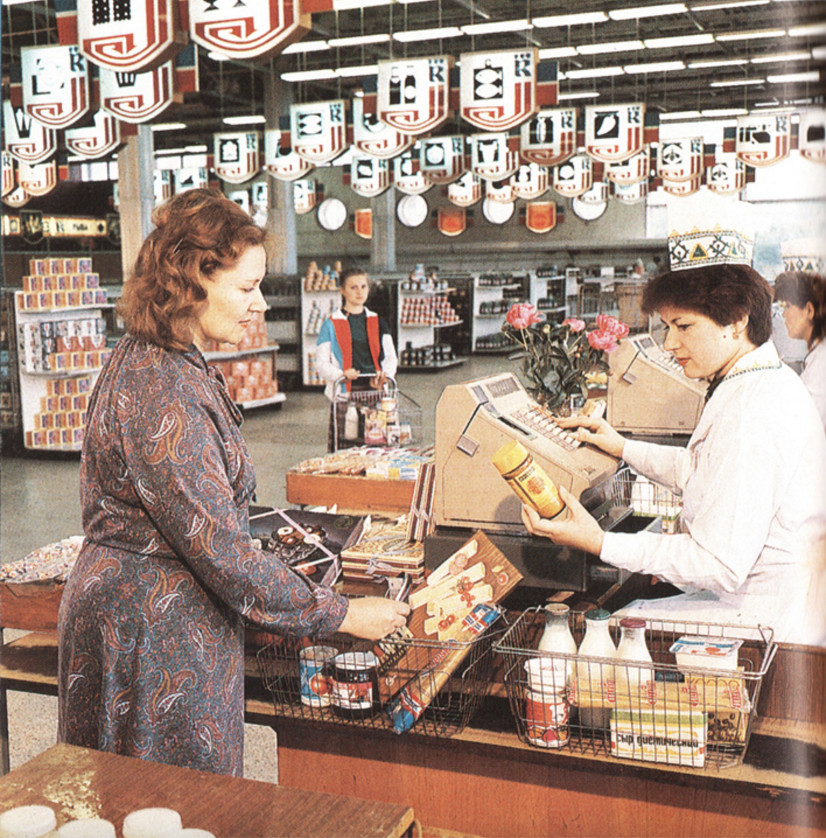 На постановочном фото 1987 года (вряд ли в реальной жизни в вазе у кассы распускались пионы) в роли покупательниц — женщины. Как будто мужчину поразила бы молния, если бы он вдруг озаботился покупкой спагетти. В корзине у покупательницы — вафли, макароны, что-то похожее на томатную пасту, бутылки с молоком и кефиром, диетический сыр, кофе в зернах… В комментариях к снимку даже разгорелся спор: что держит в руках продавщица — кофе или пачку растворимого напитка а-ля Yupi? Знатоки все же склоняются к первому варианту.