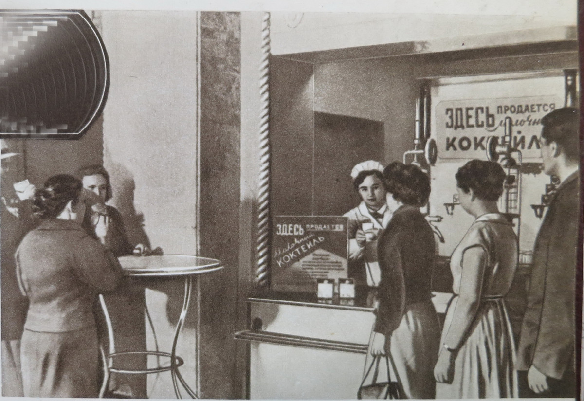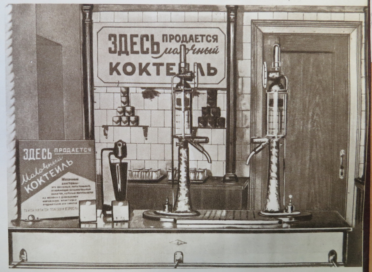 Минск, магазин №13, 1959 год. Прилавок для продажи коктейлей. Справа расположен дозатор молока, слева — коктейлевзбивательный аппарат. Коктейли изготавливались из молока, сливочного мороженого, соков, джемов и сиропов