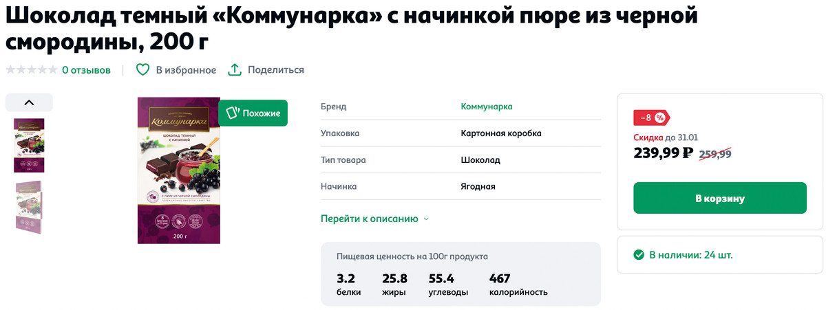 Мы посмотрели, сколько стоит этот шоколад в других российских сетях: на 25 ноября его можно было купить по цене от 199,9 до 299,9 российского рубля. Акции дают более выгодную цену — но такое не повсеместно.
