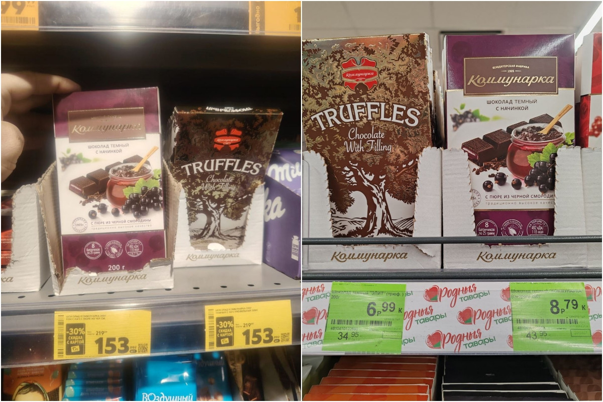 Мы показали эти ценники представителям «Коммунарки» — там ответили, что, судя по желтому ценнику, товар сейчас продается со скидкой. А обычная цена их шоколада в России не такая уж низкая, она вполне сравнима с нашей.
