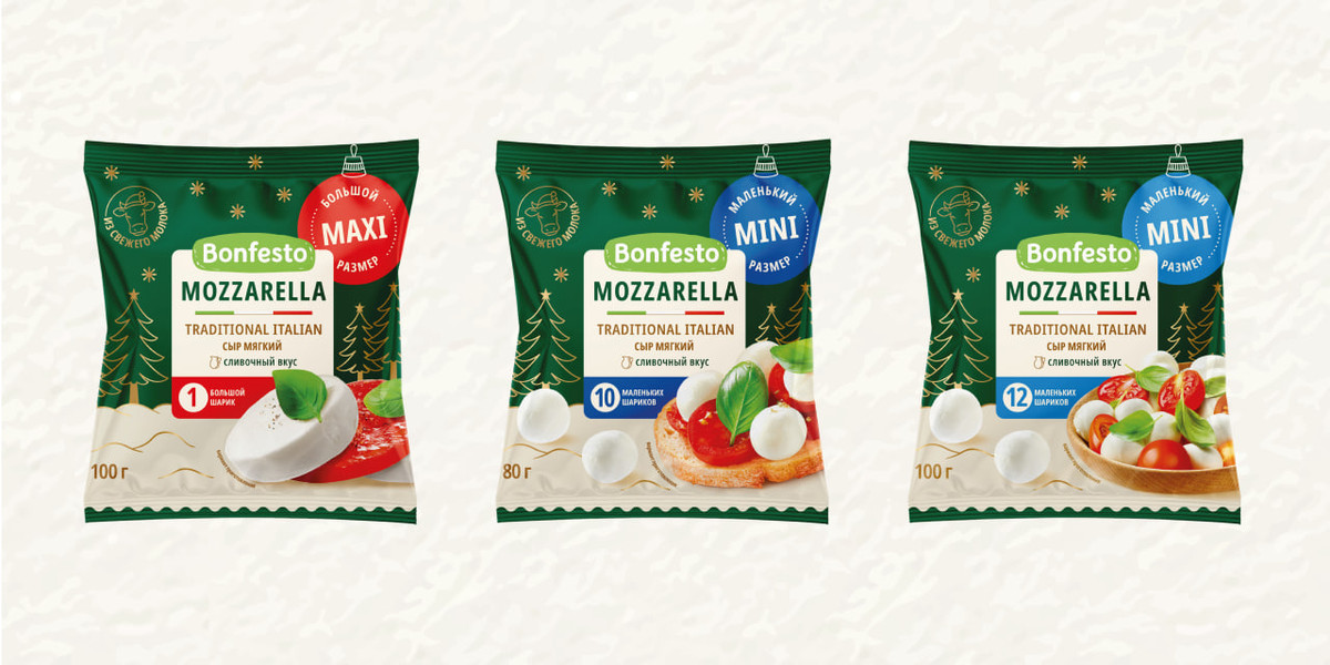 Bonfesto обновил упаковки моцареллы — теперь шарики сыра продаются в нарядной упаковке с темно-зеленым фоном и яркими цветовыми акцентами. Дизайн дополнили праздничные мотивы и пожелания. А сам сыр можно использовать в канапе, закусках и салатах.