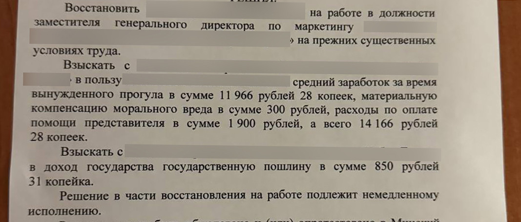 — По рекомендации вашего юриста обратилась в суд. Он вынес решение о восстановлении на работе, выплате компенсации за время вынужденного прогула, компенсации морального вреда и судебных расходов, — поделилась читательница.