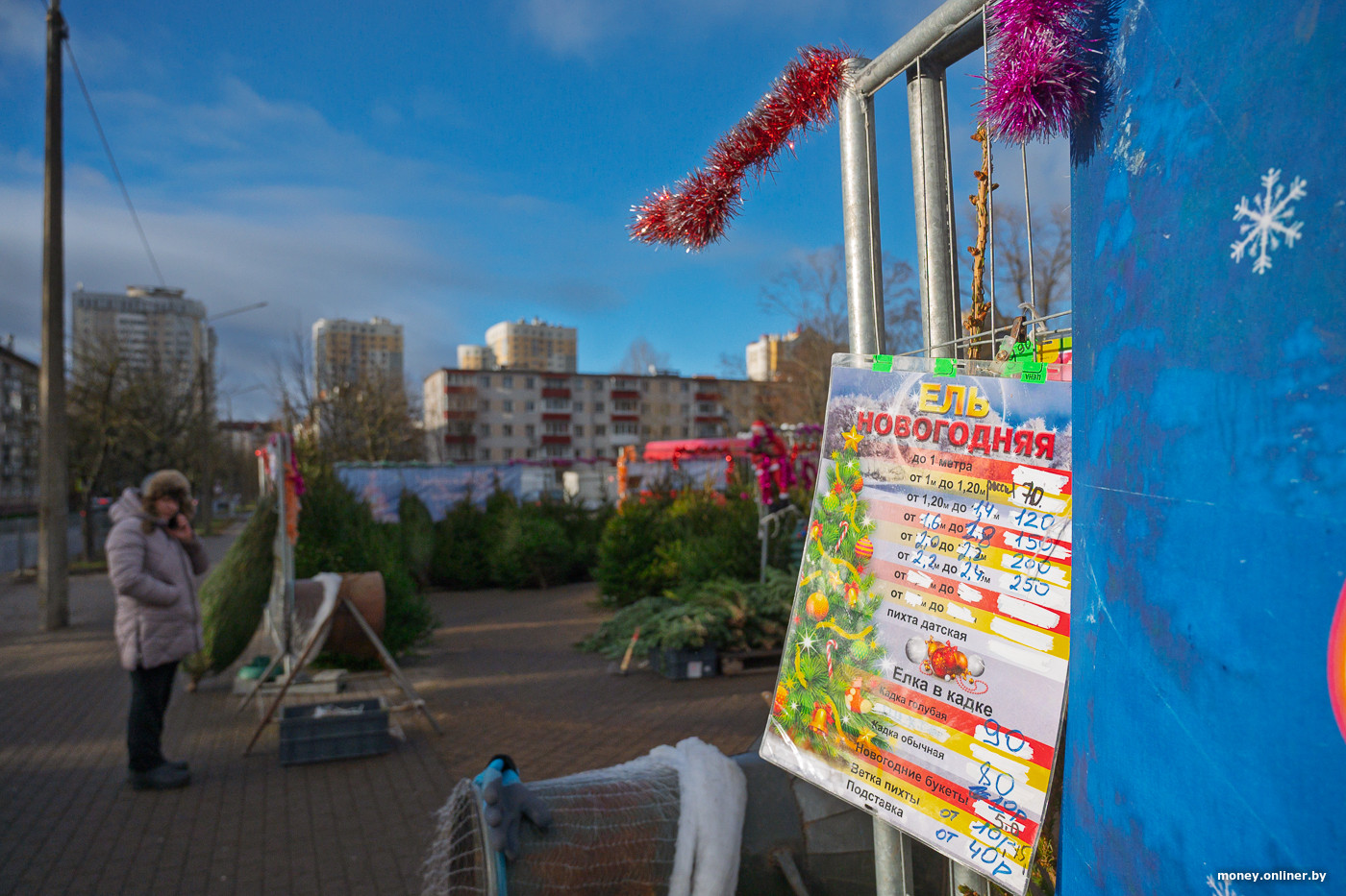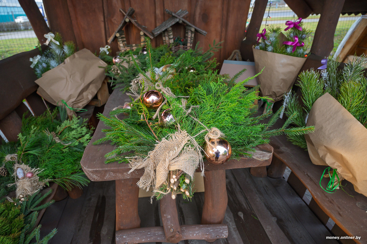 Самая дешевая елка или сосна на базаре возле Ждановичей — 21,7 рубля, за такую цену можно рассчитывать на дерево до 1 метра. Елка под 2 метра будет стоить 30 рублей, за елку до 3 метров придется заплатить 38 рублей. Деревья в кадках будут от 40 до 65 рублей. Для тех, кто ценит компактность и быструю уборку, — букеты за 25 рублей.