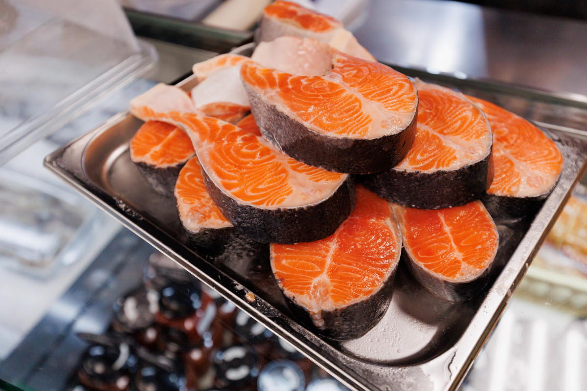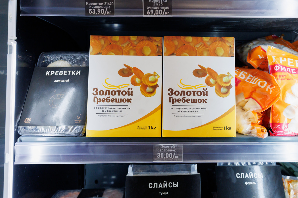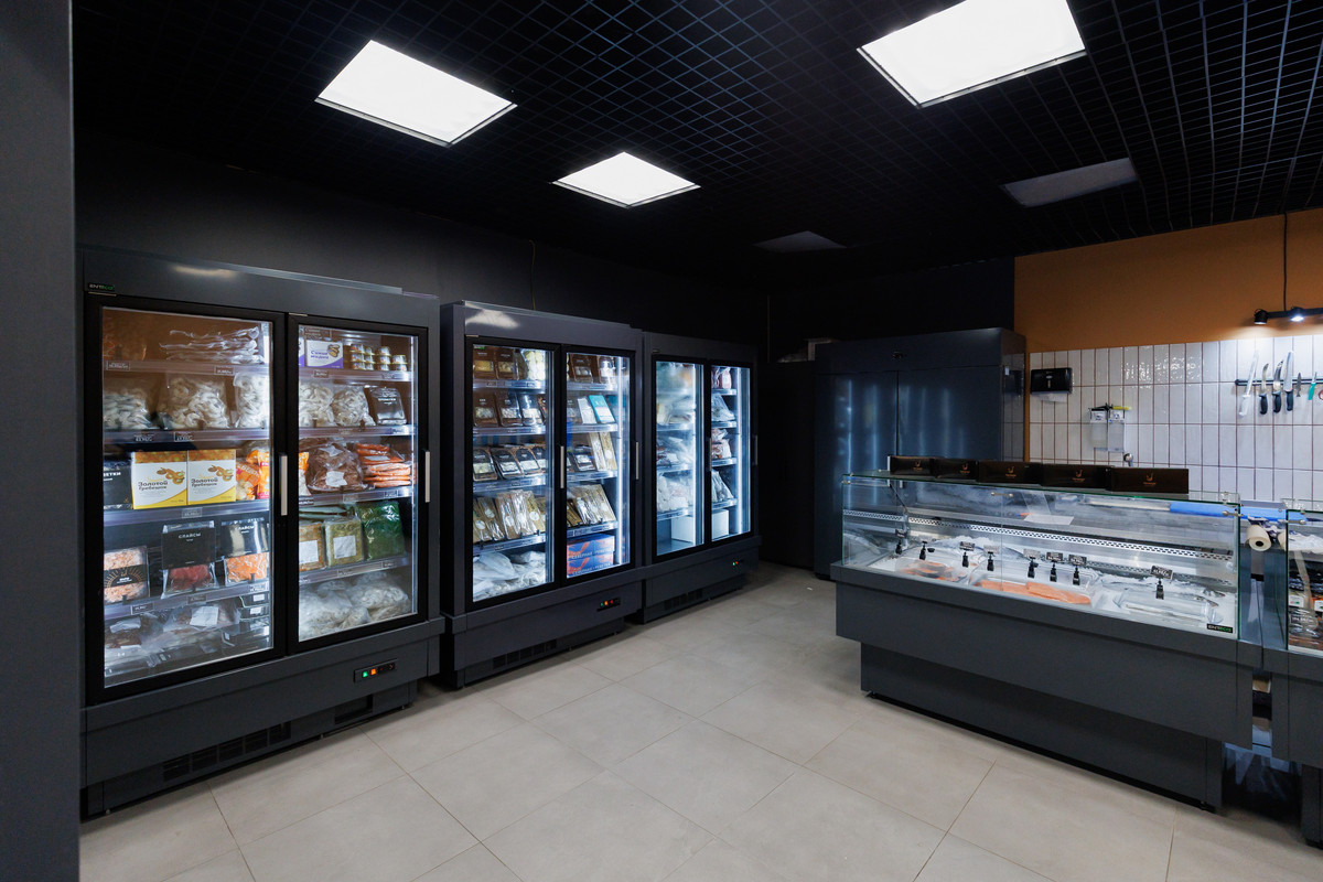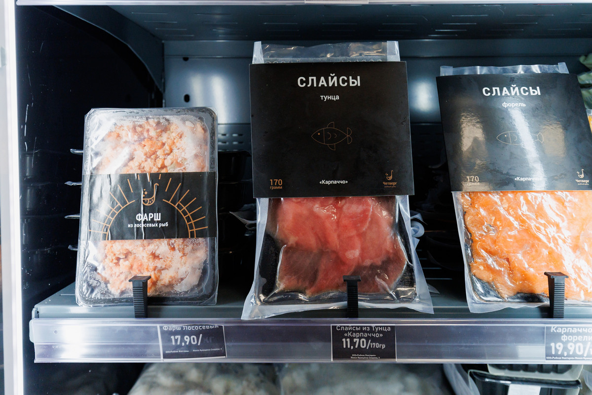 Сбоку выстроились холодильники с замороженной рыбой и морепродуктами. Тут «водятся» большие креветки, кальмары, осьминоги, гребешки в ракушках, синие и черные мидии. Есть также слайсы под карпаччо, жареный угорь, медальоны и стейки из тунца. Отдельная секция выделена под рыбные полуфабрикаты: гедза, пельмени, палочки, тефтели из форели, фишболы и мидии в маринаде. Среди супов — том кха, том ям с морепродуктами и борщ с огромным куском форели. Из необычного — «белковая бомба» из филе минтая под сыром.