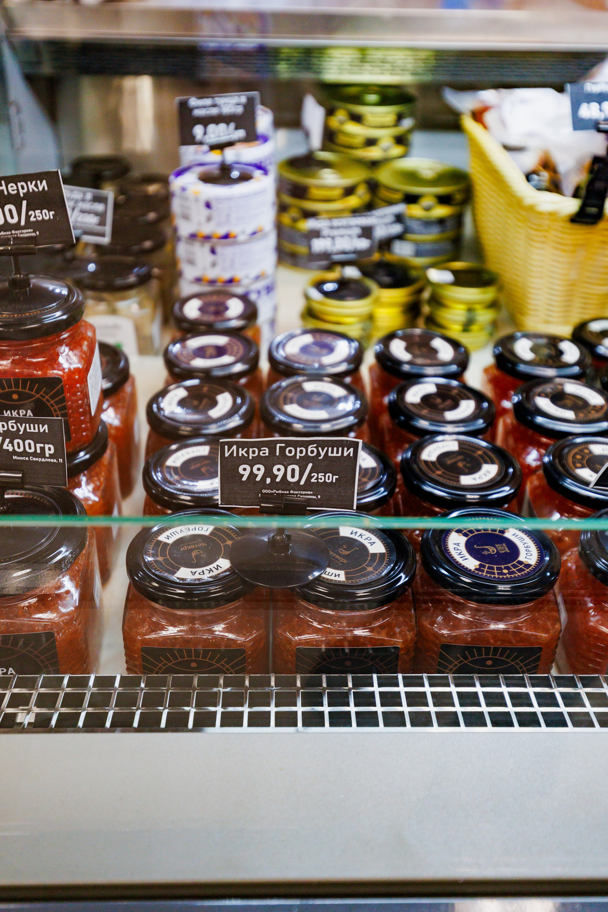 Основная витрина ломится от изобилия красной и черной икры, в том числе отборной — от 20-летних осетров. Рядом выложена красная рыба — как соленая, так и копченая. Их дополняют консервы с осетриной, тунцом и крилем.
