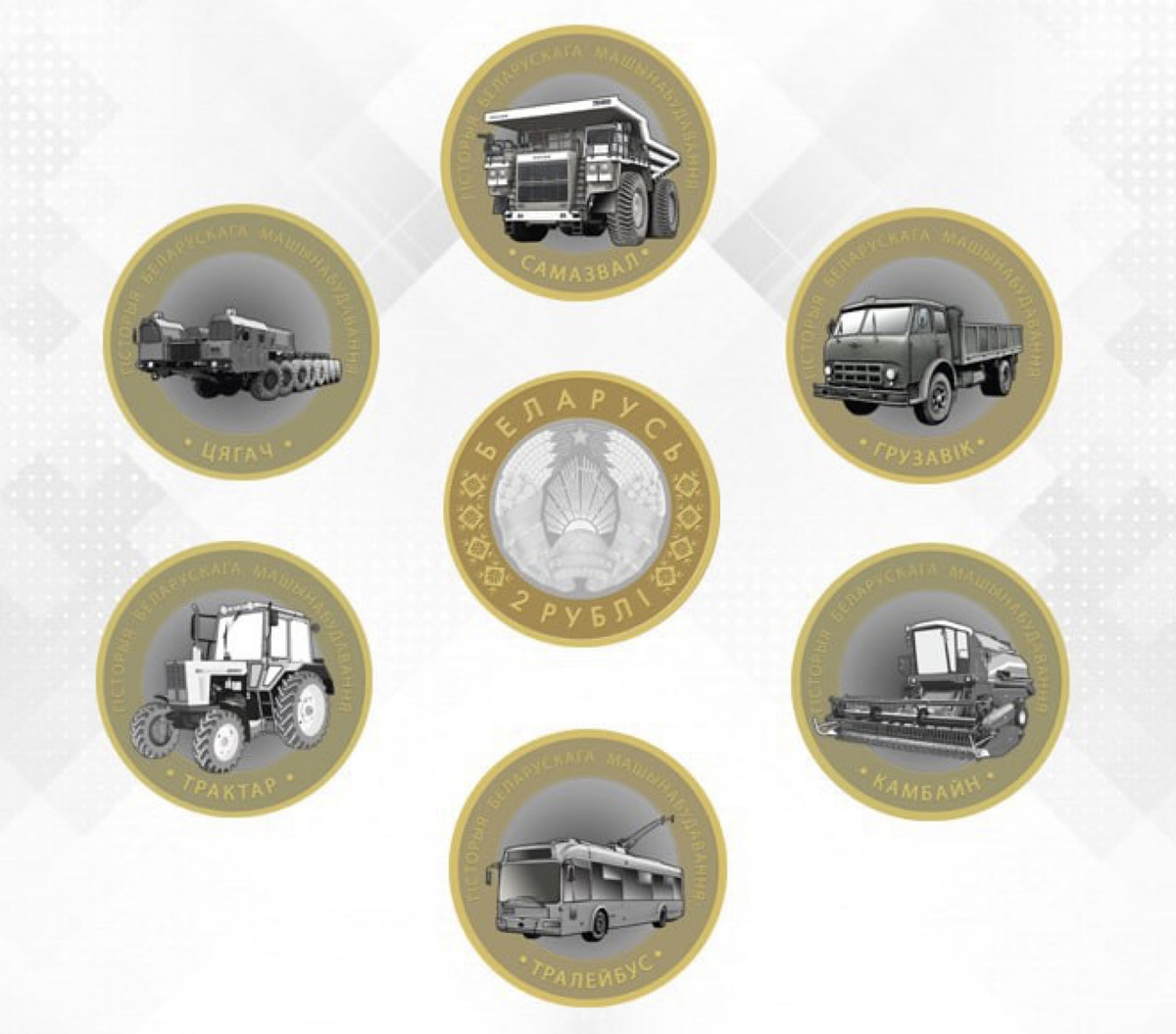 В серию вошли шесть монет: «Самазвал», «Грузавік», «Цягач», «Трактар», «Тралейбус» и «Камбайн». Номинал каждой монеты составляет 2 белорусских рубля, тираж — 25 тысяч экземпляров. Дата поступления монет в продажу будет объявлена дополнительно.