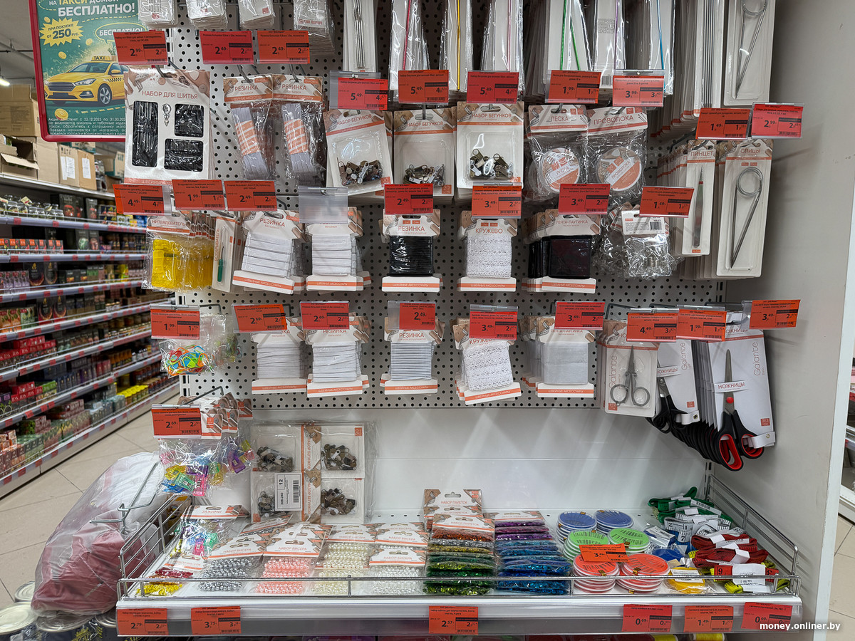 Дальше значительную часть зала занимают товары для дома — от полотенец и губок для посуды до ковриков и шторок в ванную. Есть и ассортимент для рукоделия и товары для домашнего фитнеса.