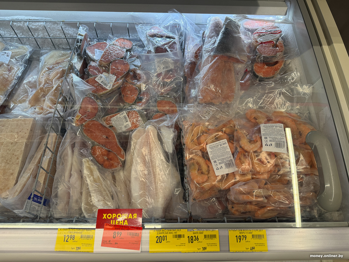 В центре зала есть несколько морозильных ларей — часть с пельменями, тестом и мороженым, часть с замороженным мясом и рыбой. В последних особенно выделяются красноватые стейки кеты и форели.