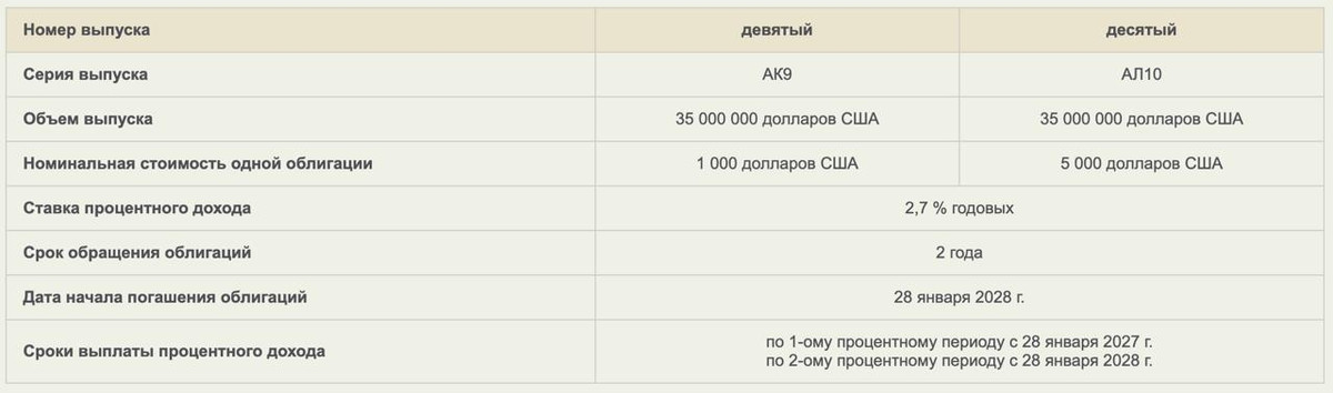 Для покупки будут доступны два выпуска. Ценная бумага выпуска АК9 имеет номинал в одну тысячу долларов США. Номинальная стоимость облигации выпуска АЛ10 составляет пять тысяч долларов США. Объем каждого из выпусков $35 млн.
