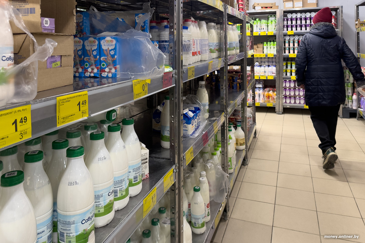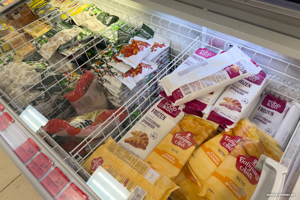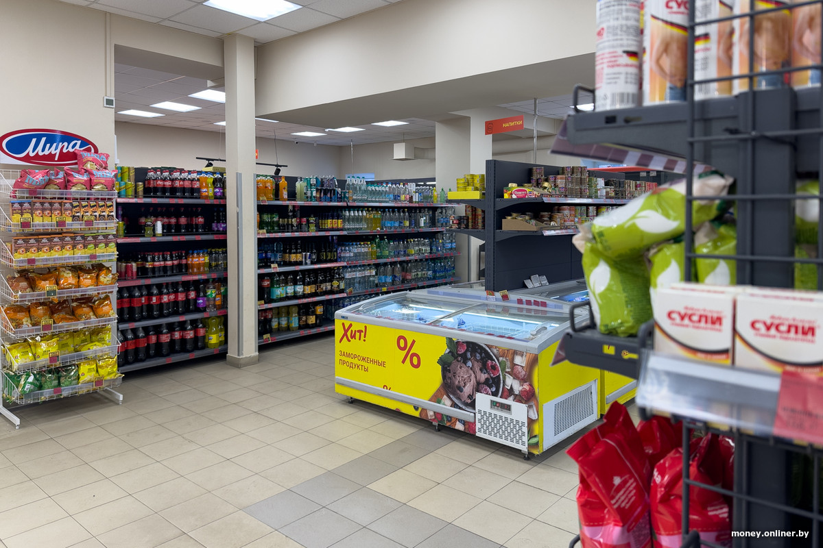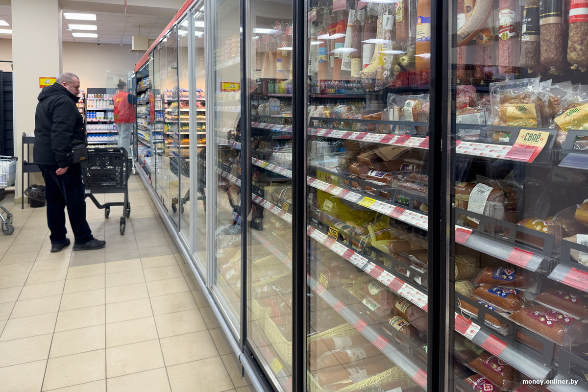 Спустя несколько рядов логика торгового зала приводит нас к холодильнику — он выглядит как отдельное помещение, вход в которое закрывают силиконовые жалюзи. Часть полок занимают торты, еще какое-то место отдано молочке и майонезу, но на большей части пространства расположились колбасы: Береза, Пинск, Дзержинск, Витебск, Молодечно, Брест, Волковыск — это наверняка не вся география производителей.