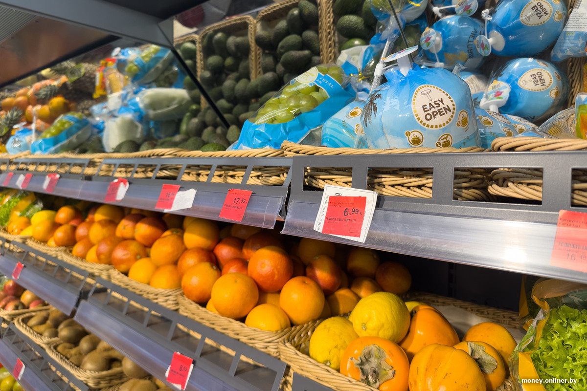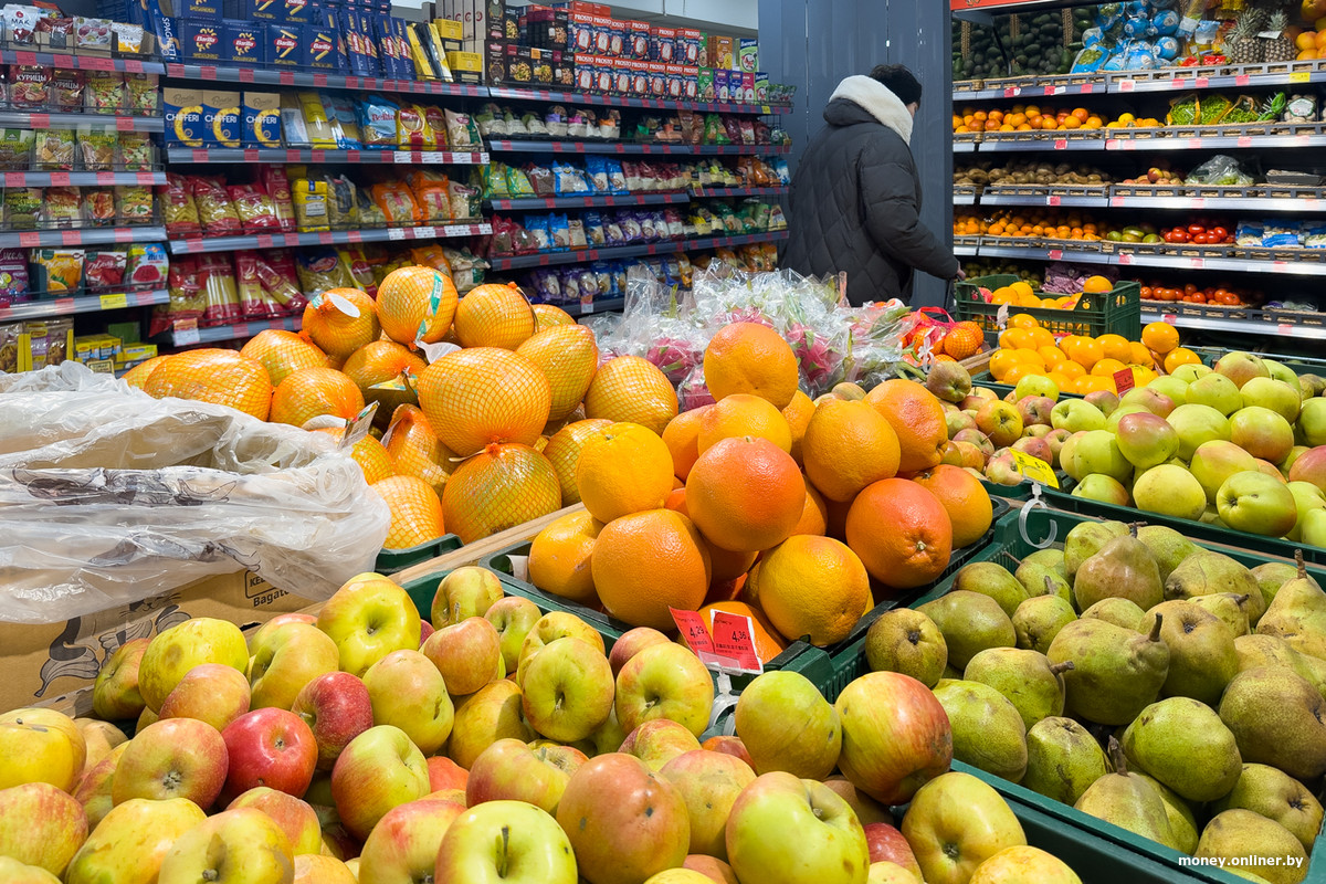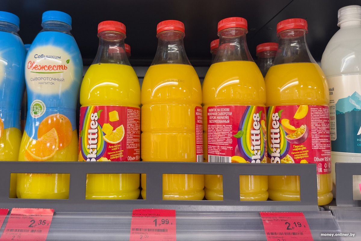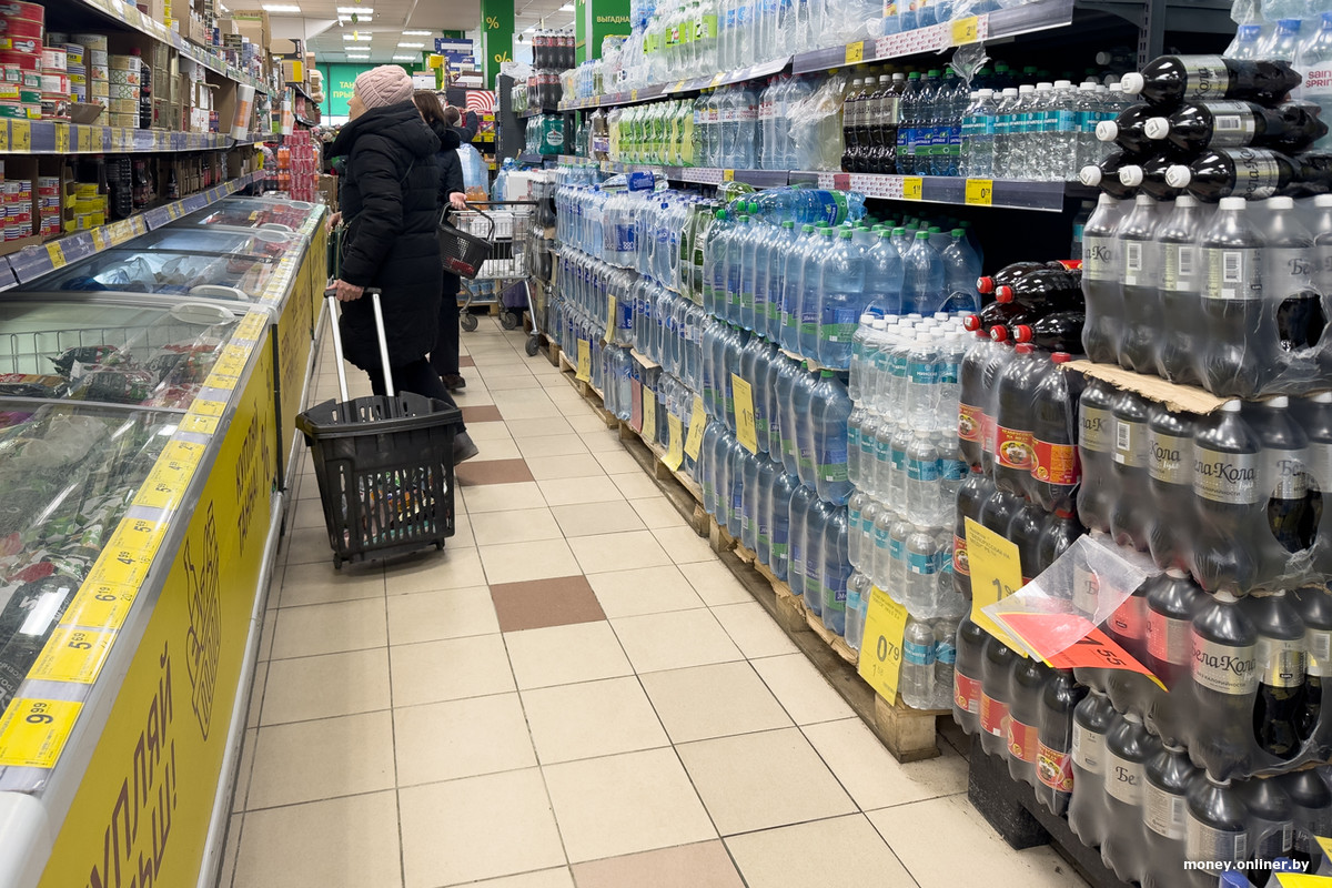 Спустя несколько рядов логика торгового зала приводит нас к холодильнику — он выглядит как отдельное помещение, вход в которое закрывают силиконовые жалюзи. Часть полок занимают торты, еще какое-то место отдано молочке и майонезу, но на большей части пространства расположились колбасы: Береза, Пинск, Дзержинск, Витебск, Молодечно, Брест, Волковыск — это наверняка не вся география производителей.