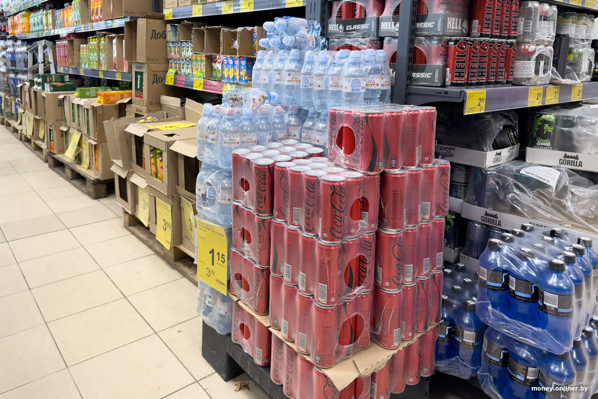 Неподалеку стоят ряды напитков — многие сразу в заводских упаковках. Кое-где коробки добираются доверху.