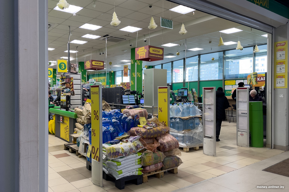 Магазин, в который мы направились утром буднего дня, занимает часть первого этажа крупного торгового центра. Работает по графику 7 дней в неделю с 09:00 до 22:00. Первое, что бросается в глаза, — это зелено-желтая цветовая гамма, навигация на белорусском языке, изображения знака «%» и слоганы, обещающие выгоду, а еще горка из грунта и стеклоомывайки, расположившаяся у входа на паллетах, — такую складскую выкладку мы увидим еще во многих частях зала.