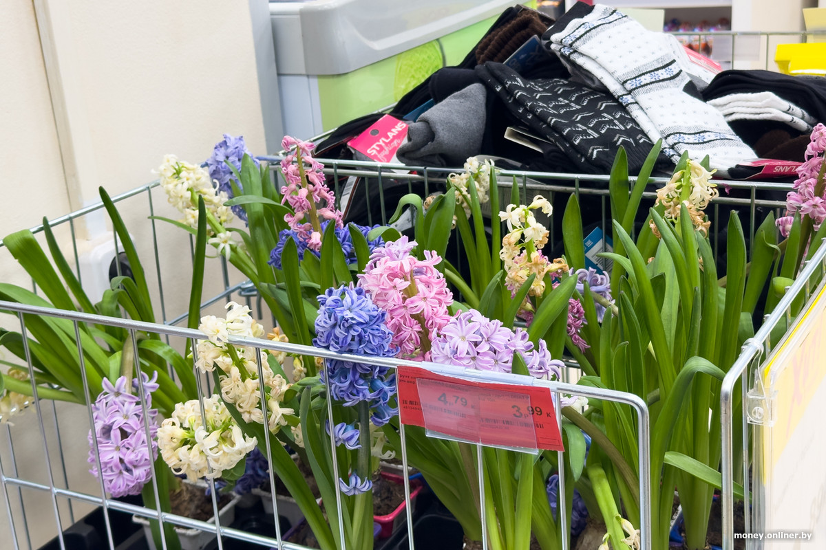 В складской выкладке запомнились разве что пакеты угля и грунт, который вместе с семенами огурцов и редиса напоминает: весна скоро. Тут же находятся и разноцветные гиацинты в маленьких пластиковых горшочках.