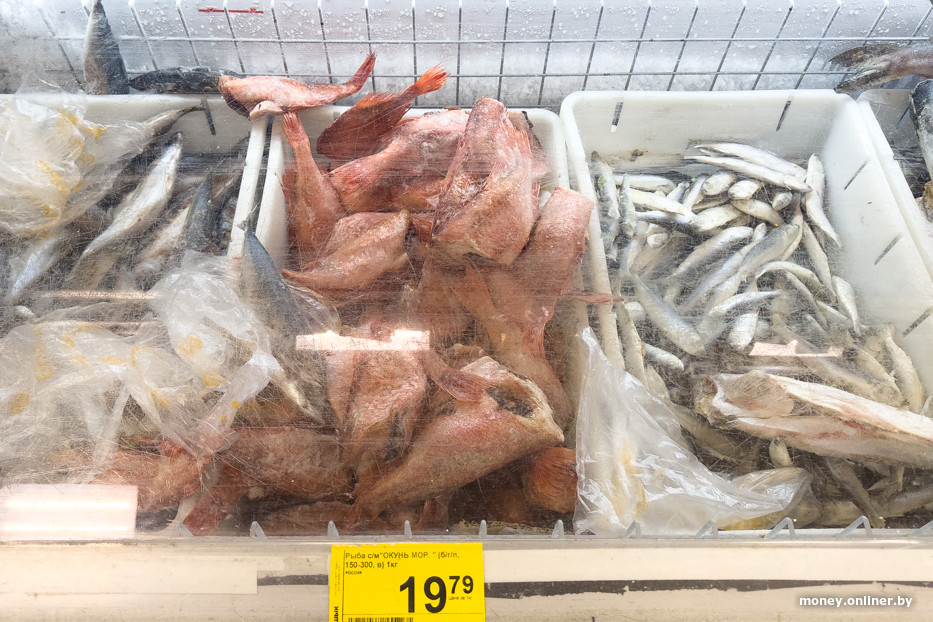 В такой же желтой цветовой гамме оформлены морозильные лари — там масло, замороженная рыба, мороженое. Есть отдел, где продавец взвешивает для покупателей сырое мясо.