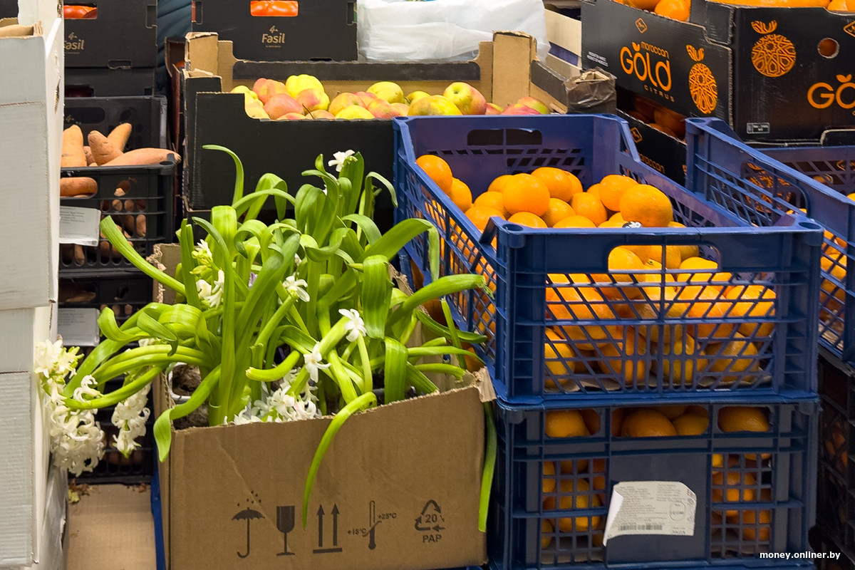 Левее призывает обратить на себя внимание полочка с мясом — там есть курицы целиком (три такие мы чуть позже заметим у одной из покупательниц в тележке). Овощи и фрукты заманивают дальше в торговый зал. Лук, картошка, бананы, виноград, апельсины — привычный ассортимент разбавляют манго и гиацинты, притаившиеся между ящиками.