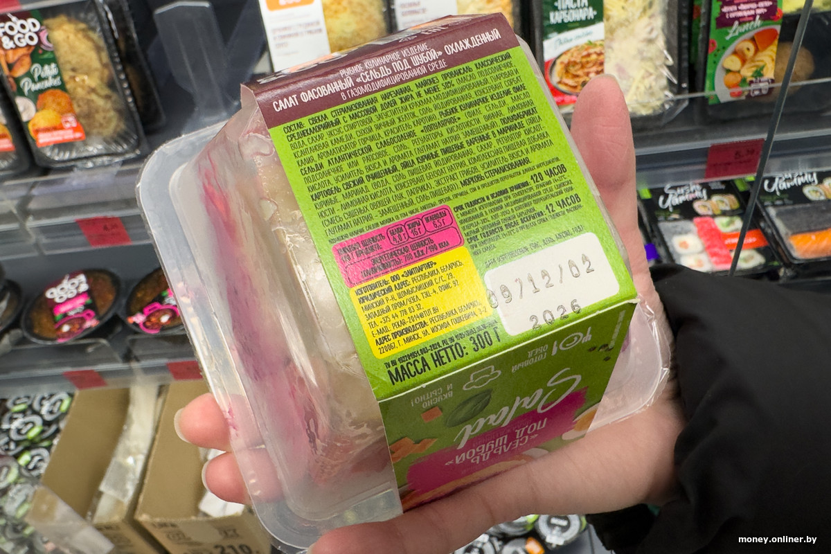 Есть полка с готовой едой: суши, салаты, гарниры с чем-то мясным. Проверяем срок годности на салате «Сельдь под шубой.