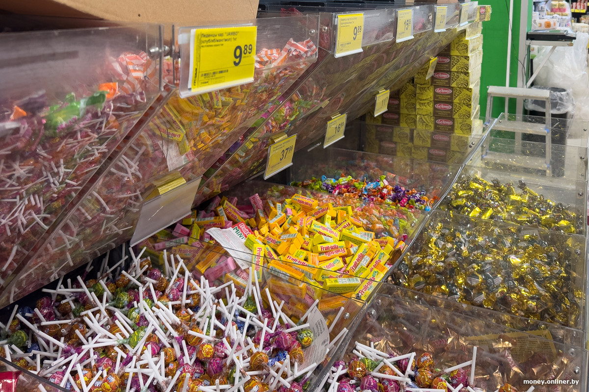 Конфеты продаются на развес. Среди разнообразия цветных фантиков выделяется пустой контейнер: в нем были конфеты «Самый умный», но закончились.
