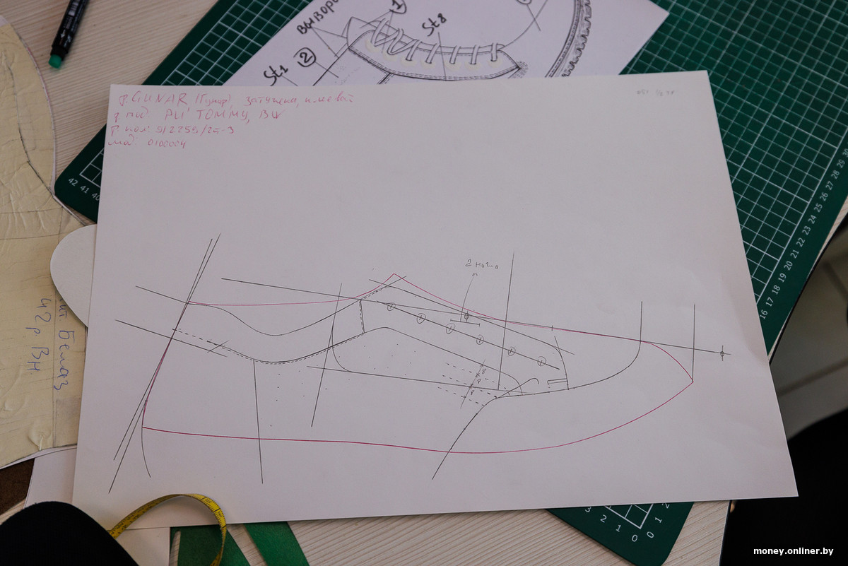 Дальше подключается колодочный участок. В отличие от многих фабрик, где используют готовые базовые колодки, здесь под каждую модель разрабатывают свою. Мастер сначала выстраивает бумажные лекала — продольные и поперечные сечения.