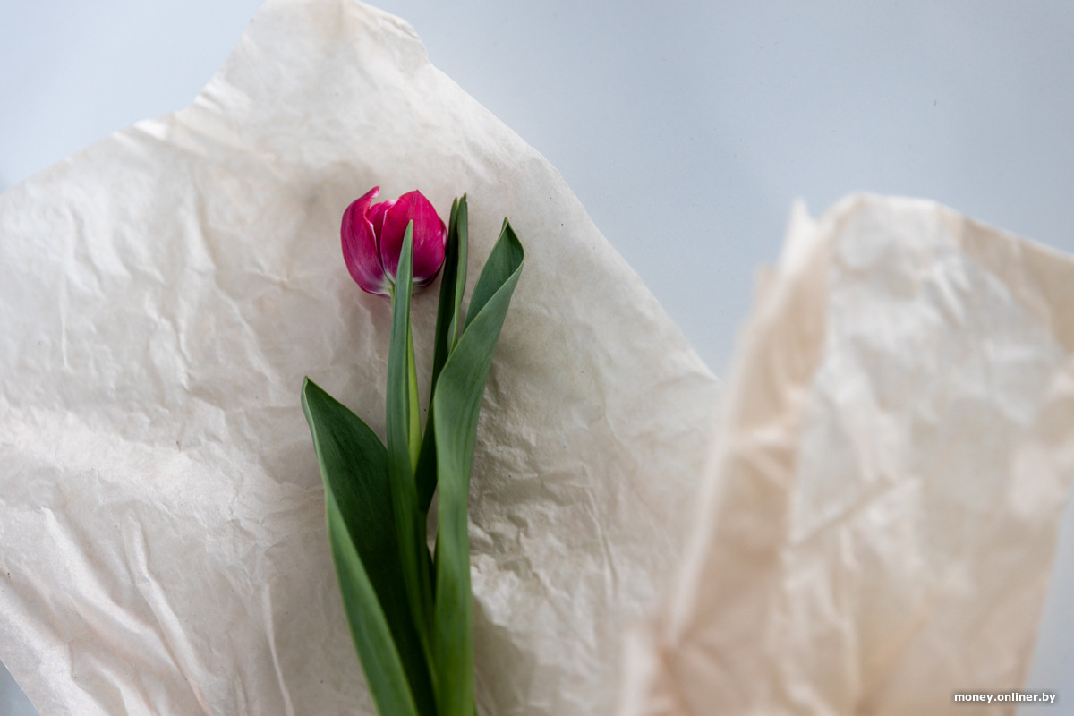 Вернемся в 25 февраля. Снег, птиц по утрам еще не слышно, весна только маячит впереди. Первый цветочный магазин, в который мы заглядываем, — это Present Simple. Тюльпаны уже есть в наличии, но не в таком многообразии сортов и оттенков, как будет через неделю. Спрашиваем и про мимозу. Продавцы признаются, что им ее привезли — но такую, что продавать невозможно. Тут нашей покупкой становится один тюльпан за 10 рублей. Его бережно заворачивают в пластиковую, теплую на ощупь пленку, скрепляют степлером. Напутствуют: в течение часа в тепле надо поставить в воду.