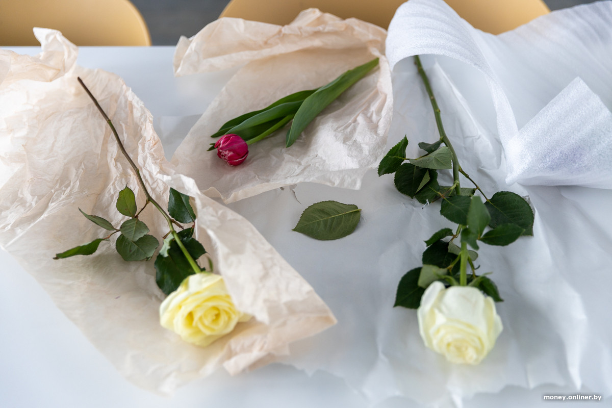 Следующая точка маршрута — цветочный магазин Seven Flowers. Мимозу купить тут тоже не удается: ее обещают привезти только на следующий день. Так что покупаем созвучный по названию и популярный у белорусок цветок — розу. Пока что про нее скажем только то, что она белая, голландская и за 8 рублей. Кстати, вечером выяснилось, что это не рекорд для белых импортных роз: ее ценник легко побила роза из другого цветочного за 12 рублей. Правда, она так и осталась в магазине, потому что наш эксперимент уже стартовал днем.