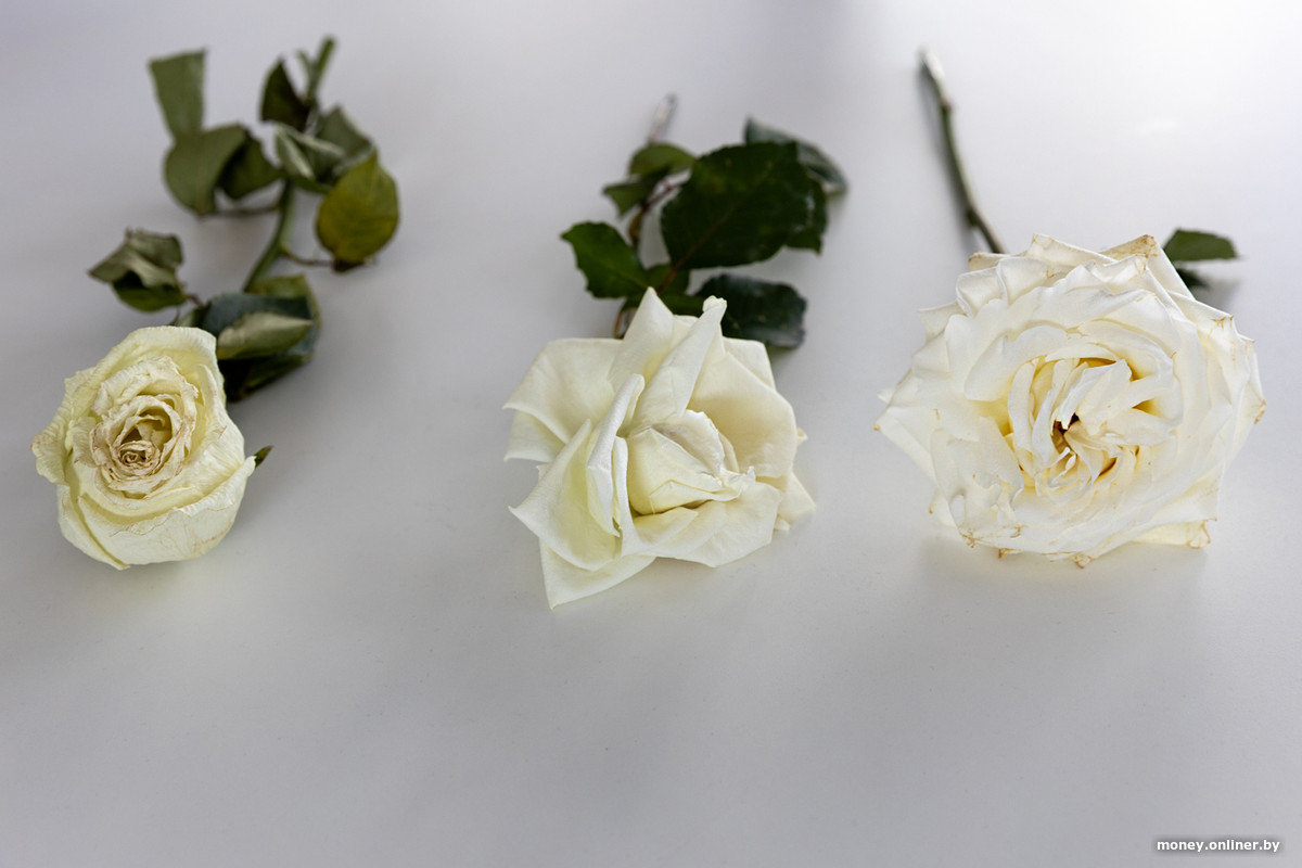 Эквадорская роза из перехода продолжает превращаться в сухоцвет. Если посмотреть на две другие розы издалека, то они идут практически наравне, а если присмотреться получше, становится заметно: у белорусской уже сдают несколько крайних лепестков.