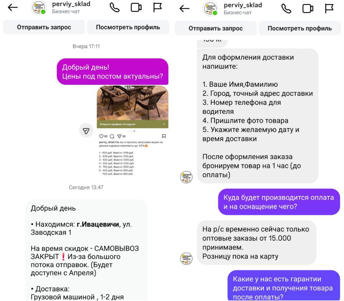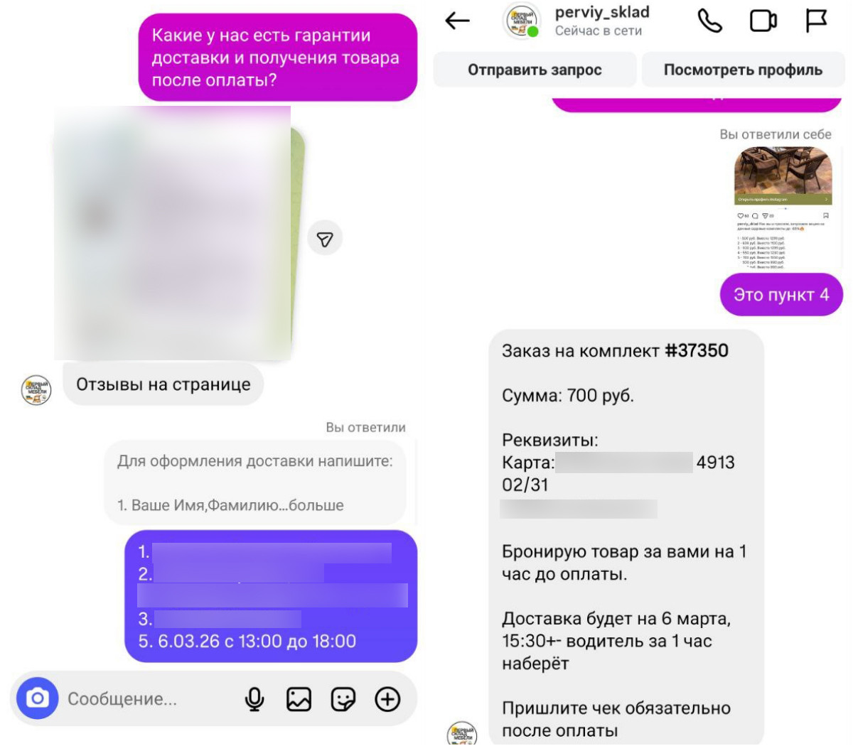 Все началось с поста в аккаунте perviy_sklad, который увидела жена Алексея. Предложение выглядело вполне убедительно: продавец представлялся ИП (мы проверили: предприниматель с такими данными не зарегистрирован), вел активную страницу в Instagram с отзывами и фотографиями, писал о скидках, а для оплаты предлагал перевести деньги на карту физлица — якобы для розничных клиентов (для юрлиц, как утверждалось, работали по безналу).