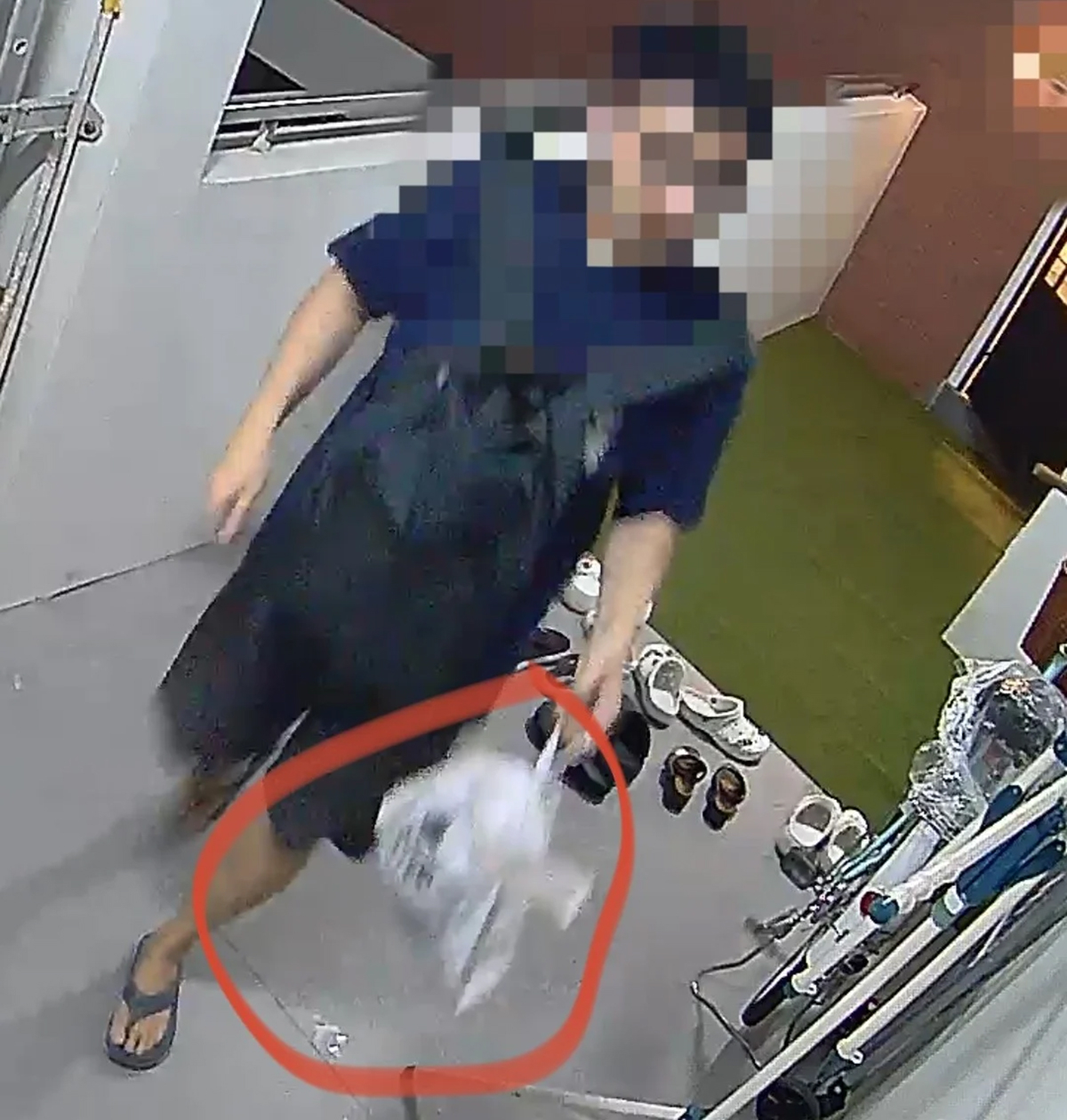 Чуть позже на кадрах с камеры видеонаблюдения видно, как покупатель в темно-синей рубашке забирает этот самый пакет и спокойно уходит.