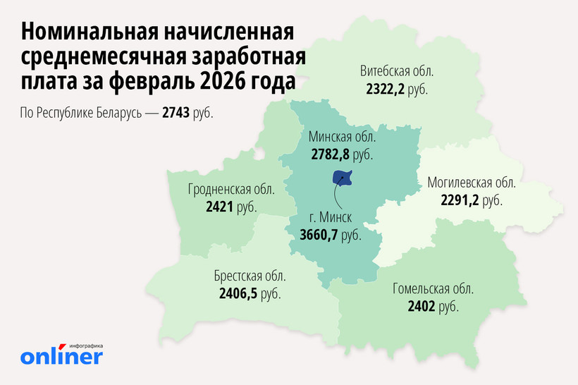 В феврале 2026 года средняя номинальная зарплата в Беларуси составила 2743 рубля до вычета налогов. Это на 14,1 рубля меньше, чем в январе. Интересно, что снижение произошло в основном за счет столицы. Почти во всех регионах, наоборот, зафиксирован рост. Исключение — Минск и Минская область.